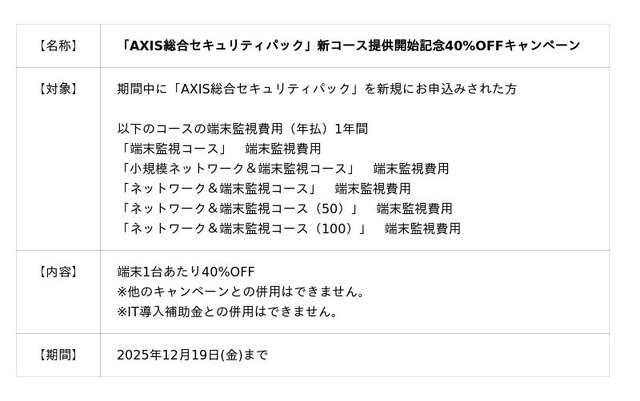 株式会社アクシス(東京都中野区、代表取締役 宮腰 行生、以下「アクシス」)は、ランサムウェアに強いサイバーセキュリティソリューション「AXIS総合セキュリティパック」の従来の3コースに加え、新たに2コースの提供を開始しました。これを記念して端末監視費用40%OFFキャンペーンを実施します。
