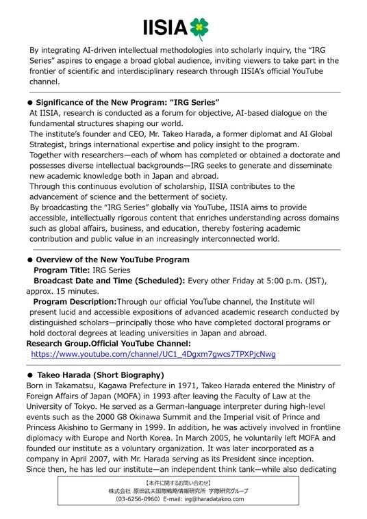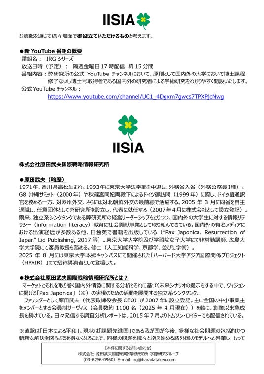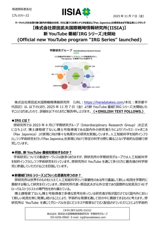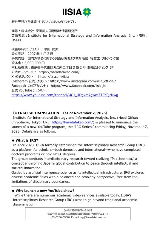株式会社原田武夫国際戦略情報研究所 (URL:https://haradatakeo.com/本社:東京都千代田区)は、以下のとおり、2025年11月7日(金)より新YouTube番組「IRGシリーズ」を開始いたすこととなりましたので、詳細を以下のとおりご報告申し上げます。(*ENGLISH TEXT FOLLOWS.)