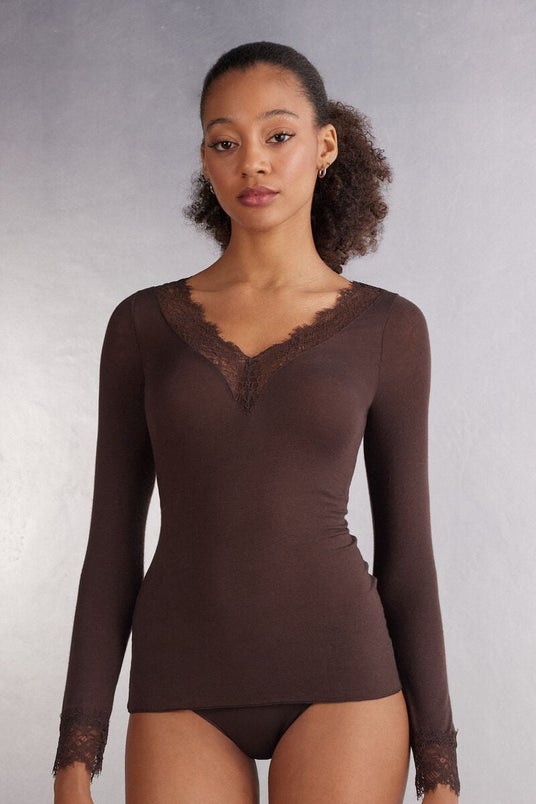 軽やかなVネックのロングレースシャツ。裾のレースがアクセントになり、1枚でも洗練された印象に。インナーとしても重ね着しやすく、寒い季節も暖かく快適に着られます。