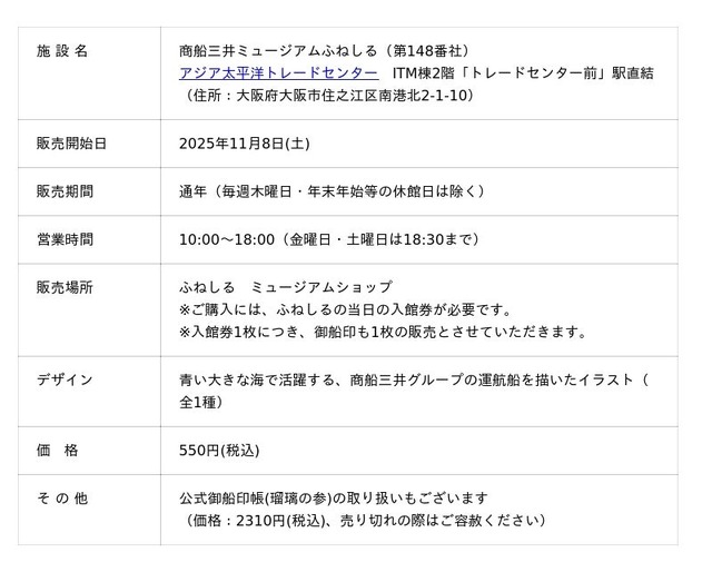 商船三井ミュージアム「ふねしる」(註1)は、神社仏閣めぐりで集められる御朱印の船バーションである「御船印(ごせんいん)プロジェクト(註2)」に参画し、2025年11月8日(土)より、オリジナル御船印の販売を開始します。