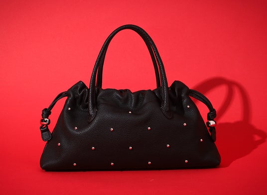 レザーの柔らかさを活かした巾着型ハンドバッグ「シュシュ(S)」に、スタッズの煌めきを。光を受けてやわらかに反射するスタッズが、クラシックなフォルムをモードに引き上げます。しなやかなソフトシュリンクレザーと、手元で揺れる金具のコントラストが、さりげないのに印象的な佇まい。デイリーにもドレスアップにも映える、上品な存在感です。
