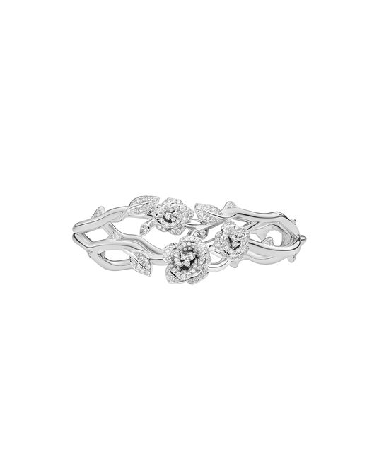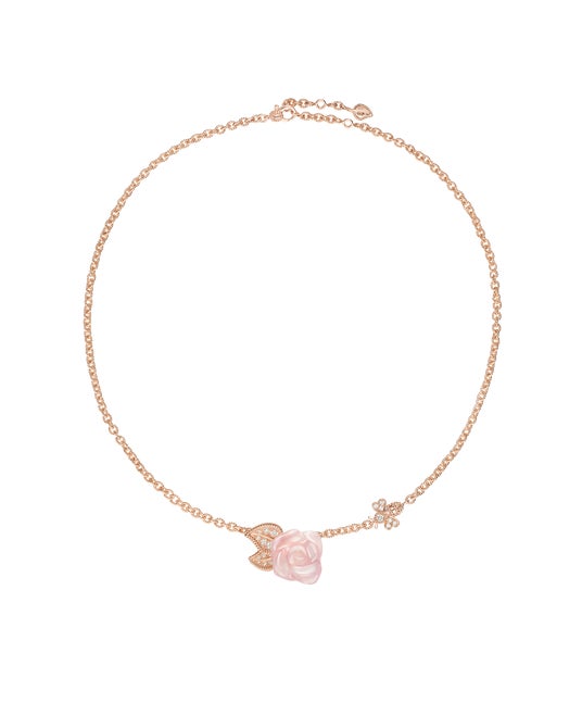 「ボワ ドゥ ローズ」からは2つの特別なネックレスが登場します。ひとつはホワイトゴールド製のチェーンにシンボリックな薔薇の茎と棘モチーフが配され、もうひとつは「ボワ ドゥ ローズ」からは初となる淡水パールをあしらったデザインで、ピンクゴールド製のシグネチャークラスプが煌めきを添えています。
