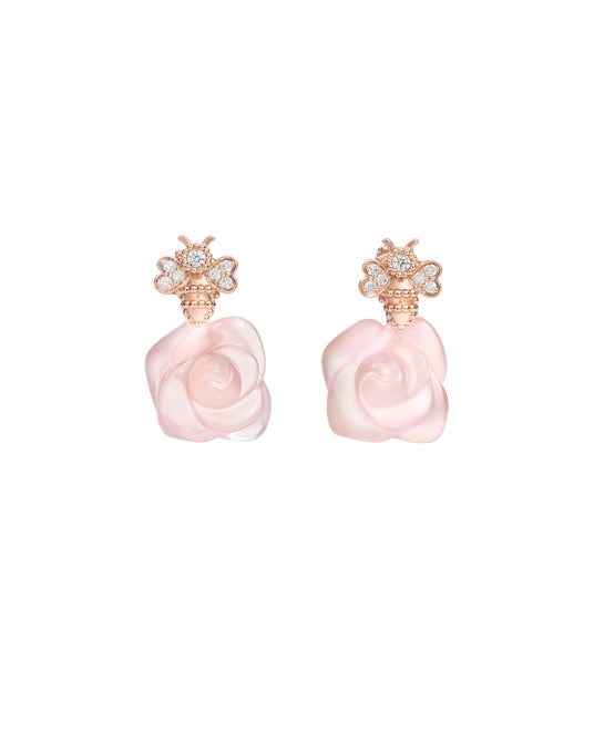 パリのバラ園に着想を得た華麗な「ローズ ディオール バガテル」からは、ホワイトゴールドに無数のダイヤモンドがあしらわれたネックレス、ブレスレットとリングが登場します。ピンククオーツを手彫りで薔薇の花を象った「ローズ ディオール プレ カトラン」は、優美なピンクローズとピンクゴールド製のミツバチモチーフを組み合わせたポエティックなデザインが特徴です。