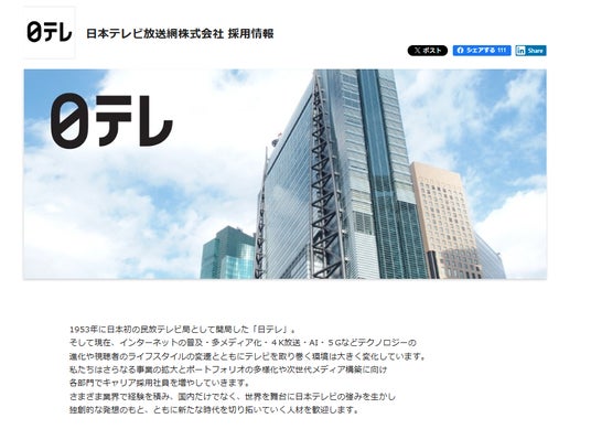 日本テレビ放送網はキャリア採用サイト内に「キャリア登録」リンクを設置
