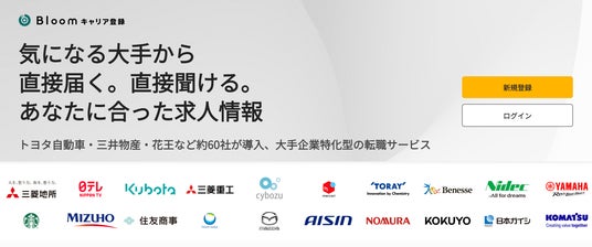 「Bloomキャリア登録」は、大手企業に特化した転職・キャリア採用プロダクトです。転職検討者は気になる大手企業を選択してキャリア情報を登録でき、経験に合った募集ポジションの案内を企業から直接受け取ることができます。2025年10月時点で65社に導入されており、トヨタ自動車、三井物産、住友商事、サントリーホールディングス、花王、KDDI、楽天グループ、NTTドコモ、野村證券、三菱地所、三井不動産など、多くの企業で活用が進んでいます。