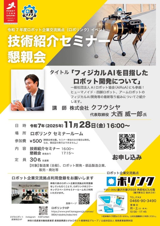 製造業(全般)、ロボット開発、部品製造企業、販売・商社等、ロボット産業に携わる方や導入を検討している施設・個人の方に向けた講演会(株式会社クフウシヤによる講演)・懇親会を開催いたします。