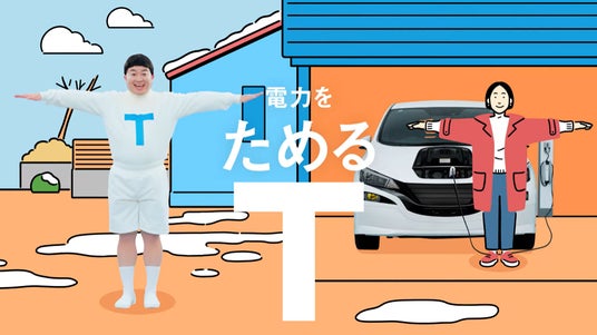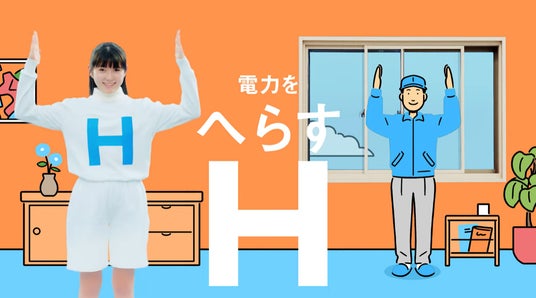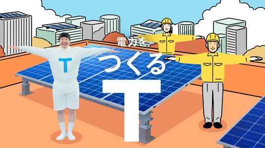 その後のシーンでは、自宅の窓を二重窓に入れ替える様子とともに、堀越さんが「二重窓でH!」と消費電力を「へらす」アクションを紹介。続けて、ソーラーパネルを設置する業者の隣で長田さんが「太陽光でT!」、電気自動車を充電する人と一緒に松尾さんが「電気自動車でT!」と、電力を「つくる」「ためる」アクションを紹介。最後は、堀越さんの「へらすの次は」という声かけにTT兄弟が「つくる、ためる。」と呼応し、「みんなも HTT♪」のリズムで締めくくられる。