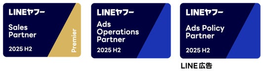 (左から、2025年度下半期「Sales Partner」「Premier」認定ロゴ、認定バッジ「Ads Operation Badge」、「Ads Policy Badge LINE広告」)