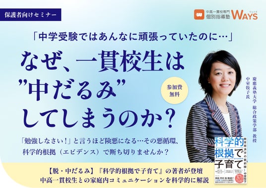 中高一貫校専門 個別指導塾WAYS(運営:株式会社メイツ、本社:東京都新宿区)は、37万部突破のベストセラー『「学力」の経済学』や『科学的根拠で子育て』の著者であり、教育経済学の第一人者である慶應義塾大学の中室牧子教授をお招きし、無料オンラインセミナー『【中高一貫校 保護者向け】教育に科学的根拠を』を2025年11月15日(土)20:00より開催します。