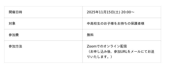 中高一貫校生のお子さまとその保護者の方に向けた、無料学習相談や体験指導なども実施しておりますので、中高一貫校に通うお子さまの勉強についてお悩みの保護者様はぜひ一度お気軽にご相談ください。
