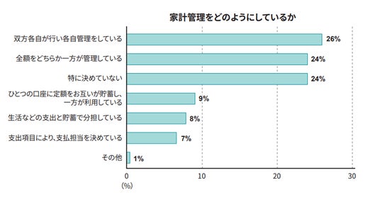 配偶者や生計をともにするパートナーがいらっしゃるかたに、家計管理をどのようにしているかおうかがいしたところ、「双方各自が行い各自管理をしている」と答えられたかたが最も多く26%となりました。「全額をどちらか一方が管理している」と回答したかたも24%に上り、各自もしくは一方のかたに寄せて管理をしているかたが半数となりました。