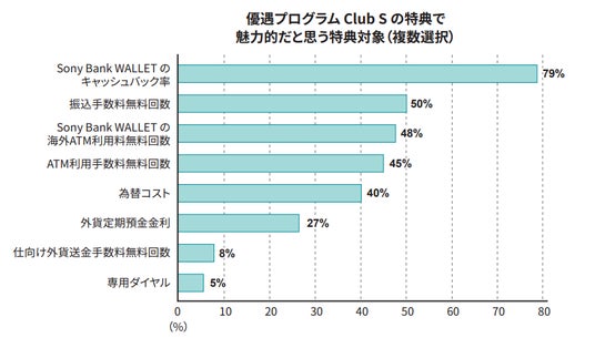 優遇プログラムClub Sで魅力的だと思う特典対象をおうかがいしたところ、最大2.0%までアップする Sony Bank WALLETのキャッシュバック率が最も多く79%となりました。次いで、振込手数料無料回数が50%、Sony Bank WALLETの海外ATM利用料無料回数も48%と、海外での特典も評価いただく結果となりました。国内のATM利用手数料無料回数も45%と、日常使いのメリットを魅力だと感じているかたが多いことがわかります。