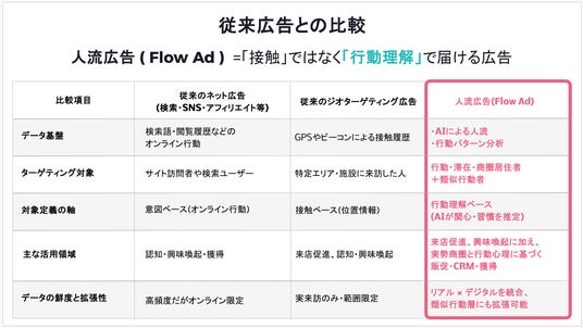 従来の「ジオターゲティング広告」や「ビーコン接触型広告」が「その場にいた人」を対象にしていたのに対し、「人流広告(Flow Ad)」はAIが行動特性や生活導線を解析し、「同様の行動・関心を持つ層」にまでリーチを可能。これにより、広告主は以下のような、より精緻で効果的なターゲティングを実現できます。