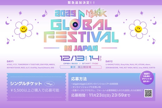 株式会社ビーエムスマイルジャパン(所在地:東京都渋谷区)が展開するライフスタイルブランド「wiggle wiggle(ウィグルウィグル)」は、2025年12月13日(土)、14日(日)に国立競技場で開催される「2025 MUSIC BANK GLOBAL FESTIVAL IN JAPAN」に合わせ、抽選で合計5名様に観覧チケット(シングル)が当たる特別キャンペーン【第2弾】を実施いたします。