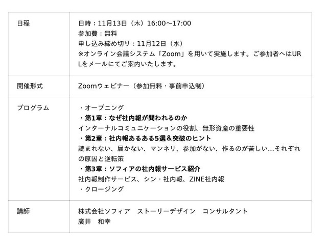 株式会社ソフィア(東京都港区麻布十番、代表取締役:廣田 拓也、以下ソフィア)は【11月13日(木)開催】社内報の作り方 ~“読まれる”から“語られる”社内報へ~と題し、無料セミナーを開催します。