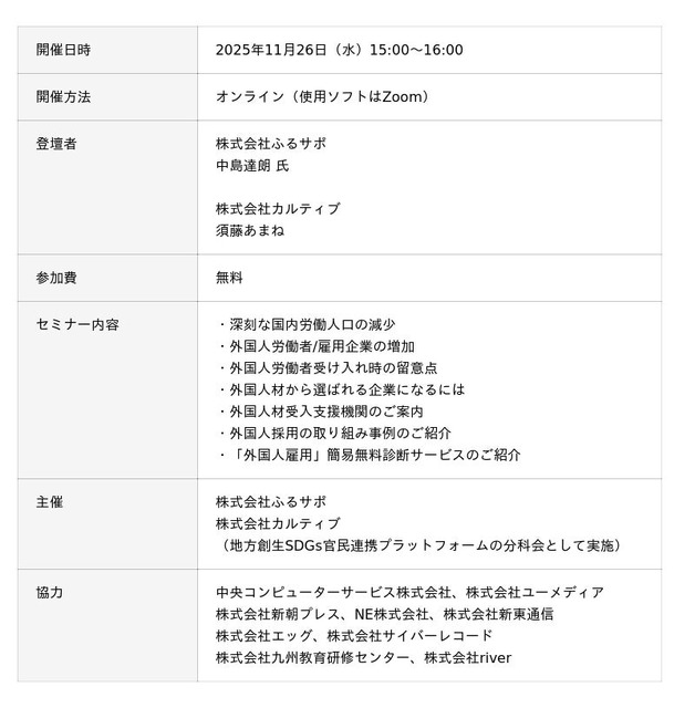 企業版ふるさと納税を活用した地域課題解決プラットフォーム「river(リバー)」を運営する株式会社カルティブ(本社:神奈川県横浜市、代表取締役:池田 清)は「地域課題解決シリーズセミナー」として、2025年11月26日(水)に地方創生と働きやすい職場環境づくりについて~外国人雇用×労務対策~オンラインセミナーを開催します。