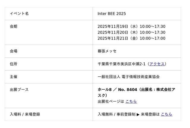 株式会社アスク 営業3部 (アスク・エムイー) は、2025年11月19日 (水) ~11月21日 (金) の3日間開催される「Inter BEE 2025」に出展し、OWC製品も展示予定です。ご来場の際は、ぜひ直接その性能をご確認ください。