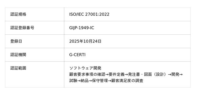 株式会社Definer(本社:東京都千代田区、代表取締役:阪本健太郎)は、ソフトウェア開発において、情報セキュリティマネジメントシステム(ISMS)の国際規格である「ISO/IEC 27001:2022」の認証を、2025年10月24日付で取得したことをお知らせいたします。