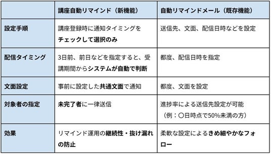 本機能は、既存の自動リマインドメール機能に比べ、管理者の設定工数を大幅に削減します。