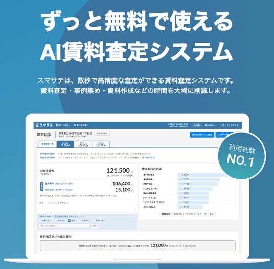 導入社数4,200社以上、管理戸数ランキングTOP10のうち8社に利用されている「スマサテ」は、数秒で高精度な査定ができる賃料査定システムです。賃料査定・事例集め・資料作成などの時間を大幅に削減します。
