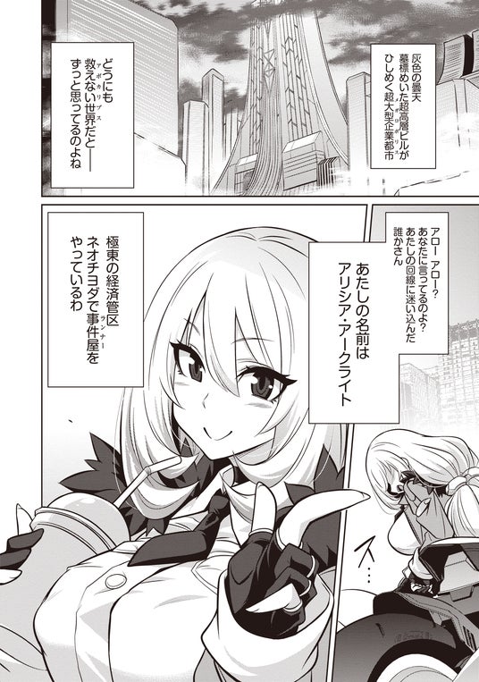 本書は同名小説をコミカライズした単行本第1巻になります。サイバーパンクな世界で探偵として活動する主人公、アリシア・アークライトはあらゆる電子機器にハッキング能力を使える≪電脳魔導師(ニューロマンシー)≫の異名を持つ少女。彼女は猫の捜索から凶悪な逃亡犯の確保まで、様々な依頼を自身が持つ能力で華麗に解決します。そんなアリシアのもとに、とある画家の捜索依頼が舞い込みます。画家がいると思われるネオマイハマ芸術解放特区(アートコミューン)に乗り込むアリシアでしたが、潜入早々に貞操の危機が訪れて……。果たしてアリシアは無事に依頼を達成できるのか!?