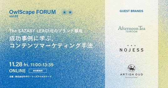 株式会社サザビーリーグアウルスケープ(本社:東京都渋谷区、代表取締役社長 相川 慎太郎、以下「アウルスケープ」)は、2025年11月28日(金)11:00~13:35に、サザビーリーグの3つのブランドのコンテンツマーケティング実践事例を解説するウェビナーを開催いたします。