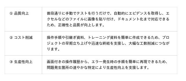 本協業では、テンダの提供する自動記録型マニュアルソリューション「Dojo」、ニーズウェルが提供するソフトウェアテストサービスの強みを連動させ、テスト準備、トレーニング、テスト実行、不具合修正・再テストのような手作業の割合が大きいテスト工程の効率化を図ります。これにより、単純な繰り返し作業から複雑なテストシナリオまで、システム開発プロジェクトで求められるさまざまなソフトウェアテストに幅広く対応した、品質向上、コスト削減、生産性向上に貢献するサービス提供を実現します。