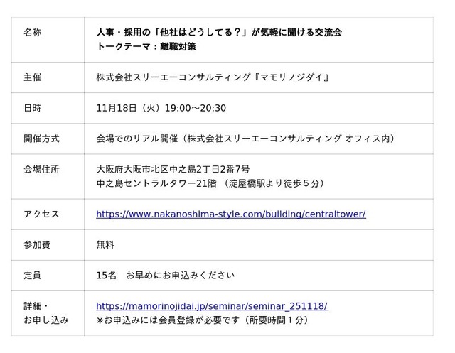 中小企業の守備力を強くするメディア『マモリノジダイ』を運営する株式会社スリーエーコンサルティング(代表取締役社長:竹嶋 寛人)は、2025年11月18日(火)19:00より、大阪にて無料イベント「人事・採用の『他社はどうしてる?』が気軽に聞ける交流会」を開催します。今回のテーマは、『離職対策』です。