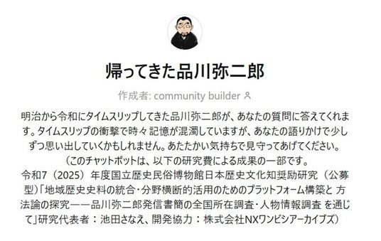 ▲帰ってきた品川弥二郎 ChatBot 画面(2025年9月試作版)
