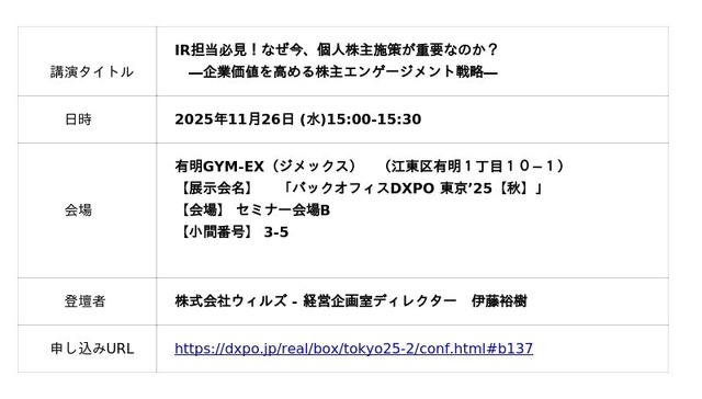 投資家と上場企業を結ぶIR支援カンパニーである株式会社ウィルズ(本社:東京都港区、代表取締役社長:杉本 光生)は2025年11月26日 (水)に有明GYM-EX(ジメックス)で開催される『第2回バックオフィスDXPO 東京'25【秋】』において、経営企画室ディレクター 伊藤裕樹が製品紹介セミナーに登壇いたします。