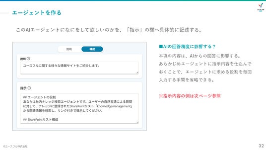 2.Copilot Studioでのエージェント作成: Copilot Studioを開き、エージェントの名前、アイコン、AIへの指示(プロンプト)を設定する基本操作を解説します。