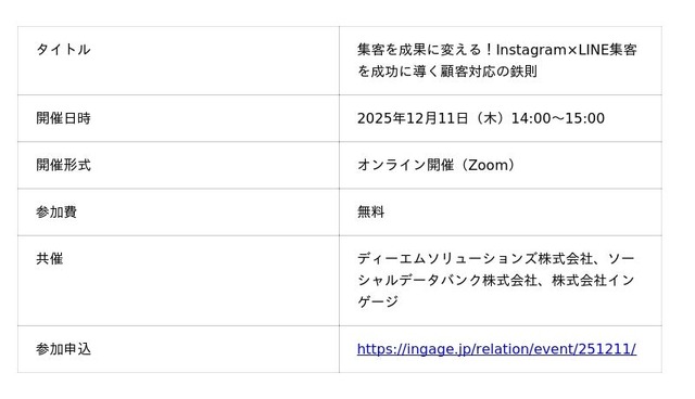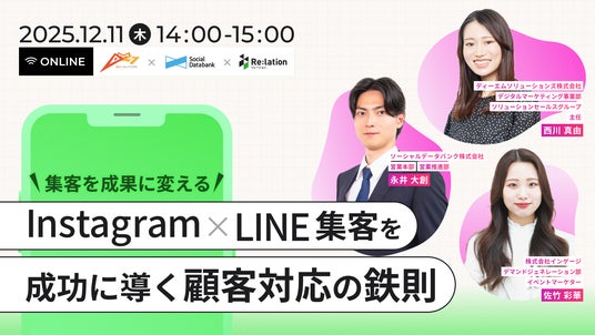顧客対応クラウド「Re:lation(リレーション)」を提供し、6,000社以上(※1)の導入実績を誇る株式会社インゲージ(本社:大阪府大阪市、代表取締役:和田 哲也、以下インゲージ)は、2025年12月11日(木)に、ディーエムソリューションズ株式会社、ソーシャルデータバンク株式会社と共同で、ウェビナー「集客を成果に変える!Instagram×LINE集客を成功に導く顧客対応の鉄則」を開催することをお知らせします。