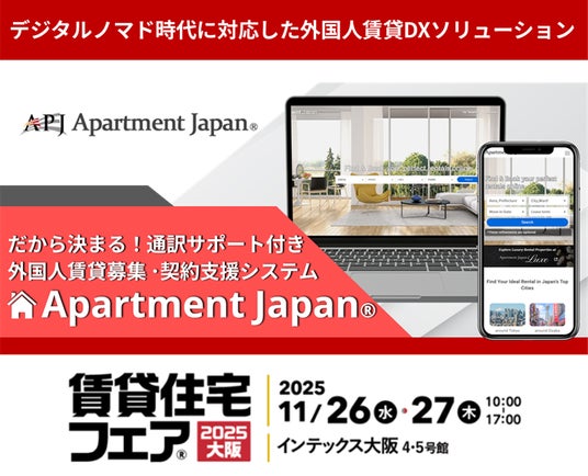 外国人向け賃貸プラットフォームApartment Japan(R)(https://apartment-japan.com/、以下「Apartment Japan」)を運営するDID-GLOBAL株式会社(本社:大阪市中央区、代表取締役:近藤 暁子、以下「DID-GLOBAL」)は、2025年11月26日(水)・27日(木)にインテックス大阪で開催される「賃貸住宅フェア2025大阪」に出展し、『だから決まる!通訳サービス付外国人賃貸募集・契約支援システム Apartment Japan(R)』を紹介します。