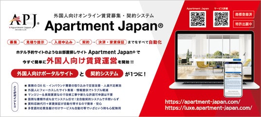 DID-GLOBAL株式会社が運営する「Apartment Japan」および「Apartment Japan-Luxe」は、外国人フレンドリーな条件(1ヶ月以上の中長期契約、保証人不要、クレジットカード決済対応など)で多様な物件を掲載する賃貸ポータルサイトです。家具付きマンション、シェアハウス、サービスアパートメント、ラグジュアリー物件などを幅広く掲載し、来日前からオンラインで物件検索、見積取得、申込、電子署名による契約、支払い、保証審査までをワンストップで完結できます。