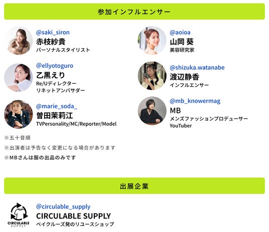 人気のファッションインフルエンサーが、会場で私服を販売します。また、ベイクルーズ発のリユースショップ「CIRCULABLE SUPPLY」も出展いたします。目利きのインフルエンサーたちのユーズド品がお手頃な価格で購入できます。