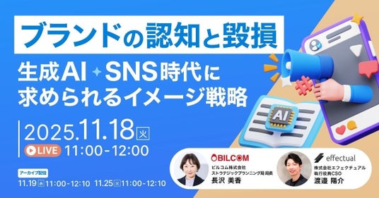 株式会社エフェクチュアル(本社:東京都港区、代表取締役:田中倫明)は、ビルコム株式会社と広報・ブランド担当者を対象にしたオンラインセミナー「ブランドの認知と毀損 ─ 生成AI・SNS時代に求められるイメージ戦略」を2025年11月18日(火)11:00より開催いたします。参加費は無料です。