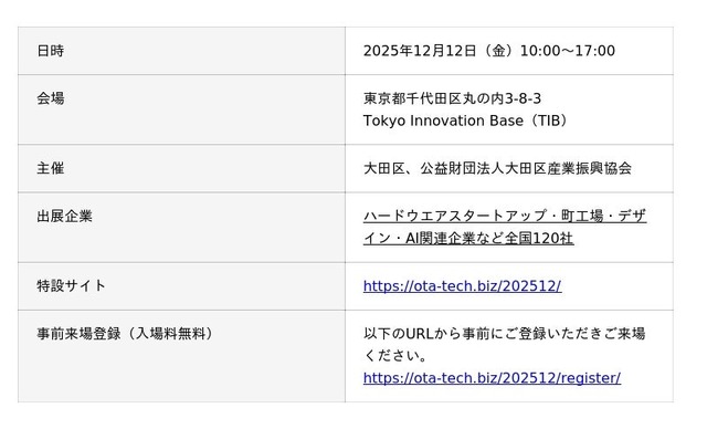公益財団法人大田区産業振興協会は、2025年12月12日(金)、Tokyo Innovation Base(TIB)にて、スタートアップ向け展示会「Meet New Solution in TIB 2025」を開催します。アイデアを持つハードウエアスタートアップ、アイデアを形にする町工場、さらにAIやデザインの力で新たな付加価値を生み出す企業が一堂に会し、次世代のソリューション創出の最前線を体感できる1日です。全国から注目スタートアップや支援者が集結し、新たな協業や事業拡大のきっかけが生まれます。ぜひご来場ください。