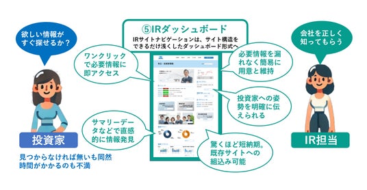 IRダッシュボードはIRトップページを「ダッシュボード」のように可能な限り、シンプルに必要な情報へワンクリックで到達できるように設定します。「迷ったらIRトップへ」というナビゲーションに変更することで、投資家の迷いを抑制し、IRサイトの管理も容易にすることを目的とするサービスです。