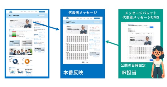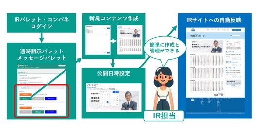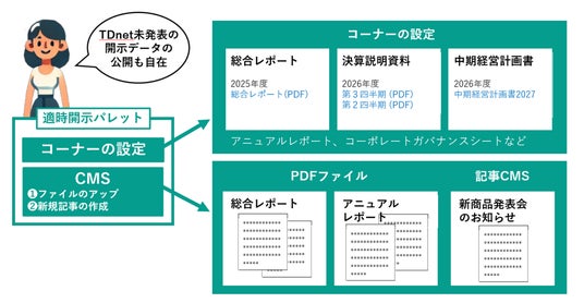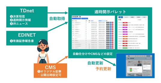 適時開示情報を自動でIRサイトに連動させるツール。独自のコーナーや開示の必要なファイルの反映、IRサイトへの独自記事の作成と日時指定した公開などのCMS機能も併せて搭載しています。