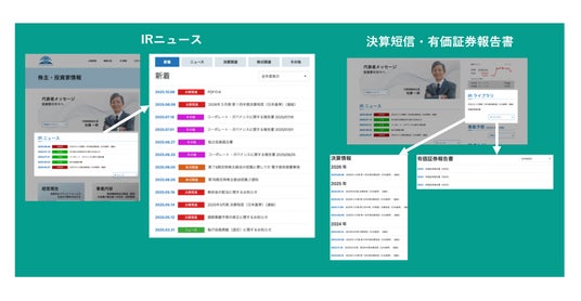 IRサイトに適時開示情報を表示することは上場企業の基本的姿勢となります。TDnetで公開したIRニュースや決算短信などの資料を手間をかけずに表示することが肝要です。加えて総合レポートやコーポレートガバナンスシートなどIRサイト独自で公開するコーナーを設けることも重要です。