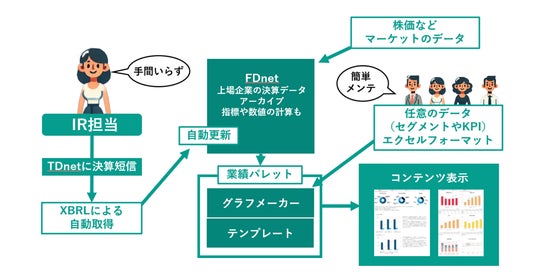 発表された決算短信からXBRLを利用して決算データを自動取得。必要な手入力データと株価関連情報を元に様々なデータを管理します。多数の自動更新項目でIRサイトの運営の効率化を図ります。