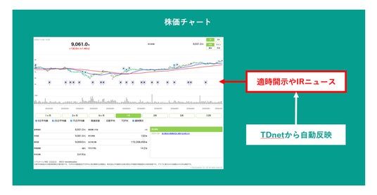 株価と株価チャートに表示が可能です。表示できる項目は多岐に渡り、PBRやROEをはじめ時価総額や配当関連情報も併記できます。株価チャートには適時開示の同時表示機能もそろえています。