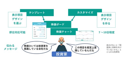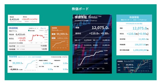株価ボードには、株価関連の様々な情報を同時に表示できます。それ以外にも経営の安全性の指数や業績や配当に関わる情報も表示できます。会社としての投資家に対するメッセージにもなります。様々な検討をしてみてください。
