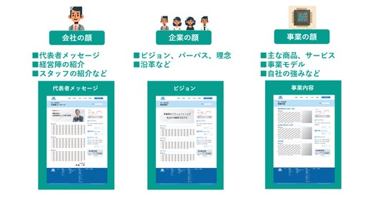 企業の顔は、業を企てる組織と文化にあたります。ビジョンやパーパス、企業理念。組織や沿革に関わる情報を提示することが重要です。会社概要のコンテンツと被った場合でも、IRサイトには最低限のエッセンシャルな内容で掲載することが投資家にとっては有効です。