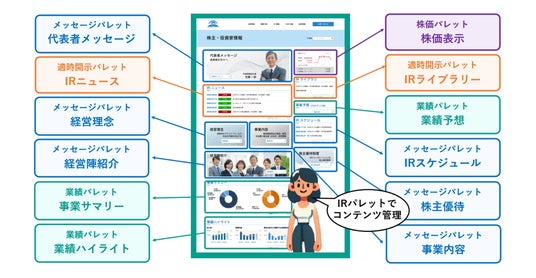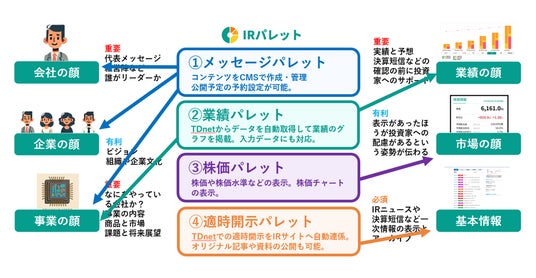 「メッセージパレット」は代表者からの投資家へのメッセージや事業の内容などの静的ページの制作と管理をCMSで支えます。「業績パレット」では事業サマリーや業績ハイライト、業績のグラフで素早い実績や業績予想の把握を表示。「株価パレット」では株価やチャートの表示。「適時開示パレット」はIRサイトに必要なIRニュースの連動や決算短信などのアーカイブをサポートします。IRダッシュボードサービスでは、投資家のナビゲーションの改善を素早く安価に実施できるソリューションを提供します。
