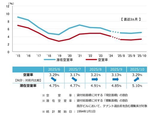 空室率は前月比プラス0.16ポイントの3.29%となり、前月から小幅に上昇した。空室を抱えて竣工した新築ビルが主な上昇要因だが、契約手続き中の区画もあり、今後は空室消化が進むとみられる。エリア別では「伏見」が前月比プラス0.7ポイントの大幅な上昇となっている。潜在空室率は前月比プラス0.25ポイントの5.10%だった。