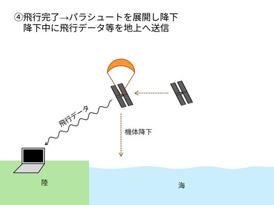 4.飛行完了後、パラシュートで降下しつつ飛行データ等は地上へ送信