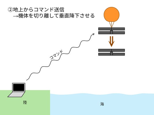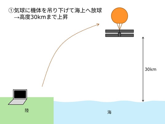1.気球に機体を吊り下げて海上へ放球し、高度30kmへ