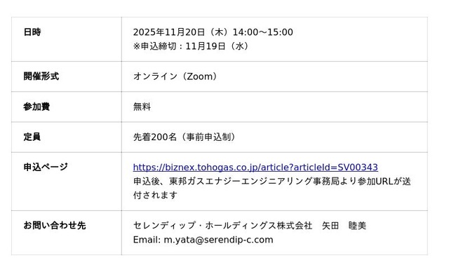 セレンディップ・ホールディングス株式会社(本社:愛知県名古屋市、代表取締役社長兼CEO:竹内 在)のグループ企業である三井屋工業株式会社(本社:愛知県豊田市、代表取締役社長:高橋 直輝 以下、三井屋工業)は、2025年11月20日(木)に開催される東邦ガスエナジーエンジニアリング株式会社(本社:愛知県名古屋市、取締役社長:玉田 勝也 以下、東邦ガスエナジーエンジニアリング)主催の「脱炭素と収益化を両立!製造現場のカーボンニュートラル実践」Webセミナーに登壇いたします。