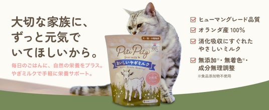 酪農大国オランダで育まれた高品質ヤギミルクを100%使用。人間が口にしても安全なレベルのヒューマングレード基準で製造し、“ペットも家族”という発想から生まれた安心のナチュラルミルクです。